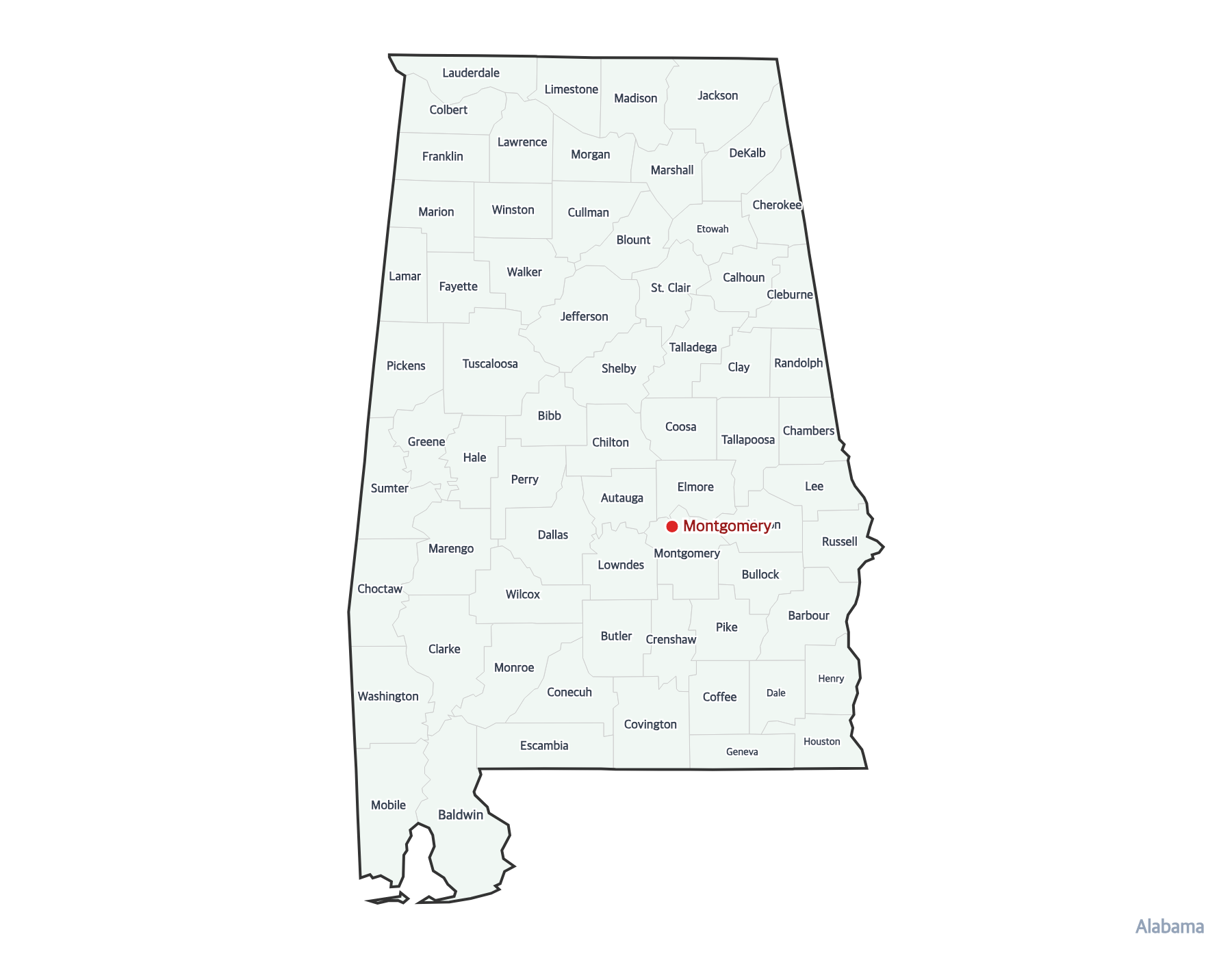 Free printable map of Alabama with all 67 county boundaries labeled. Shows the state capital Montgomery and county names. Perfect for geography study and classroom use.