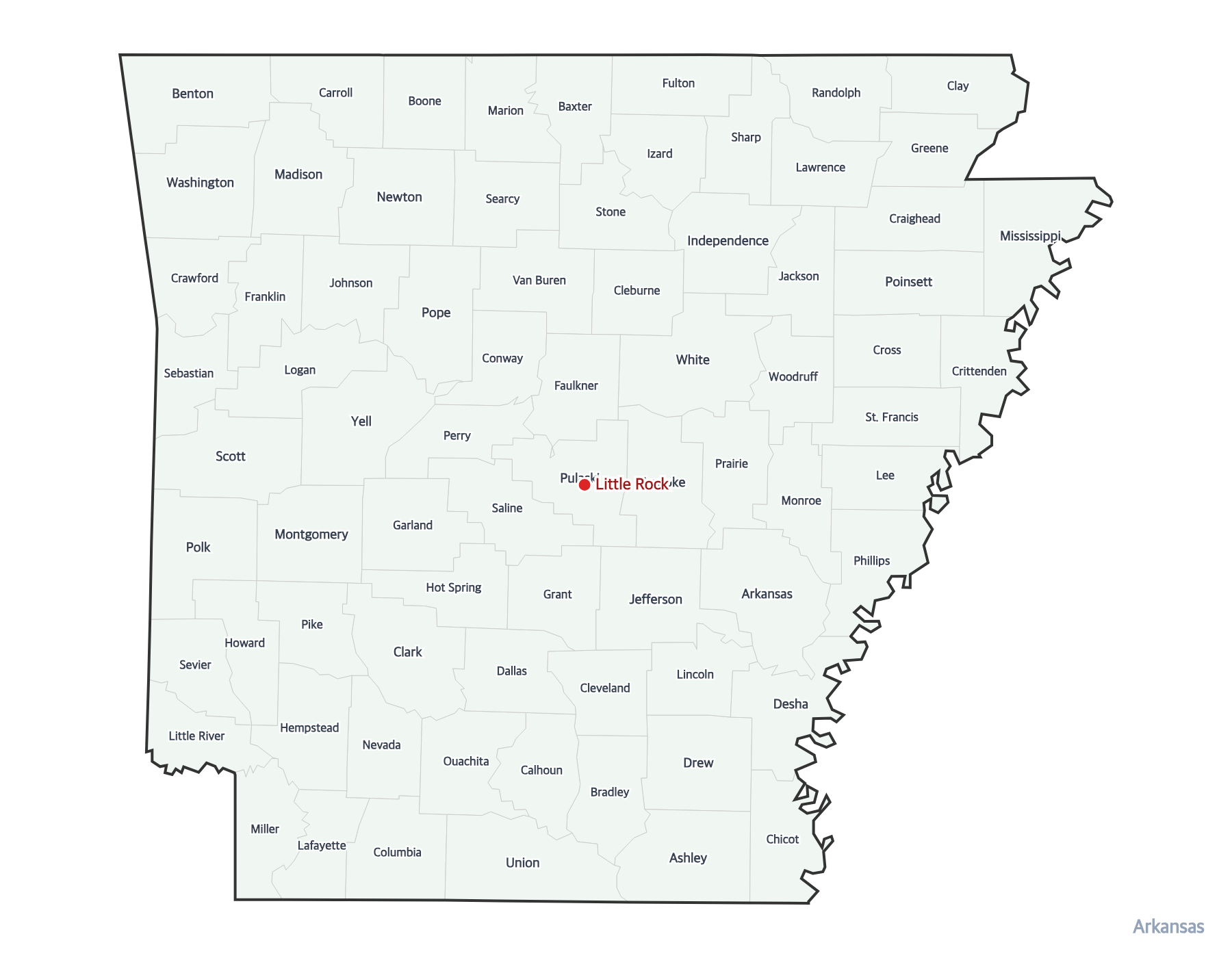 Free printable map of Arkansas with all 75 county boundaries labeled. Shows the state capital Little Rock and county names. Perfect for geography study and classroom use.