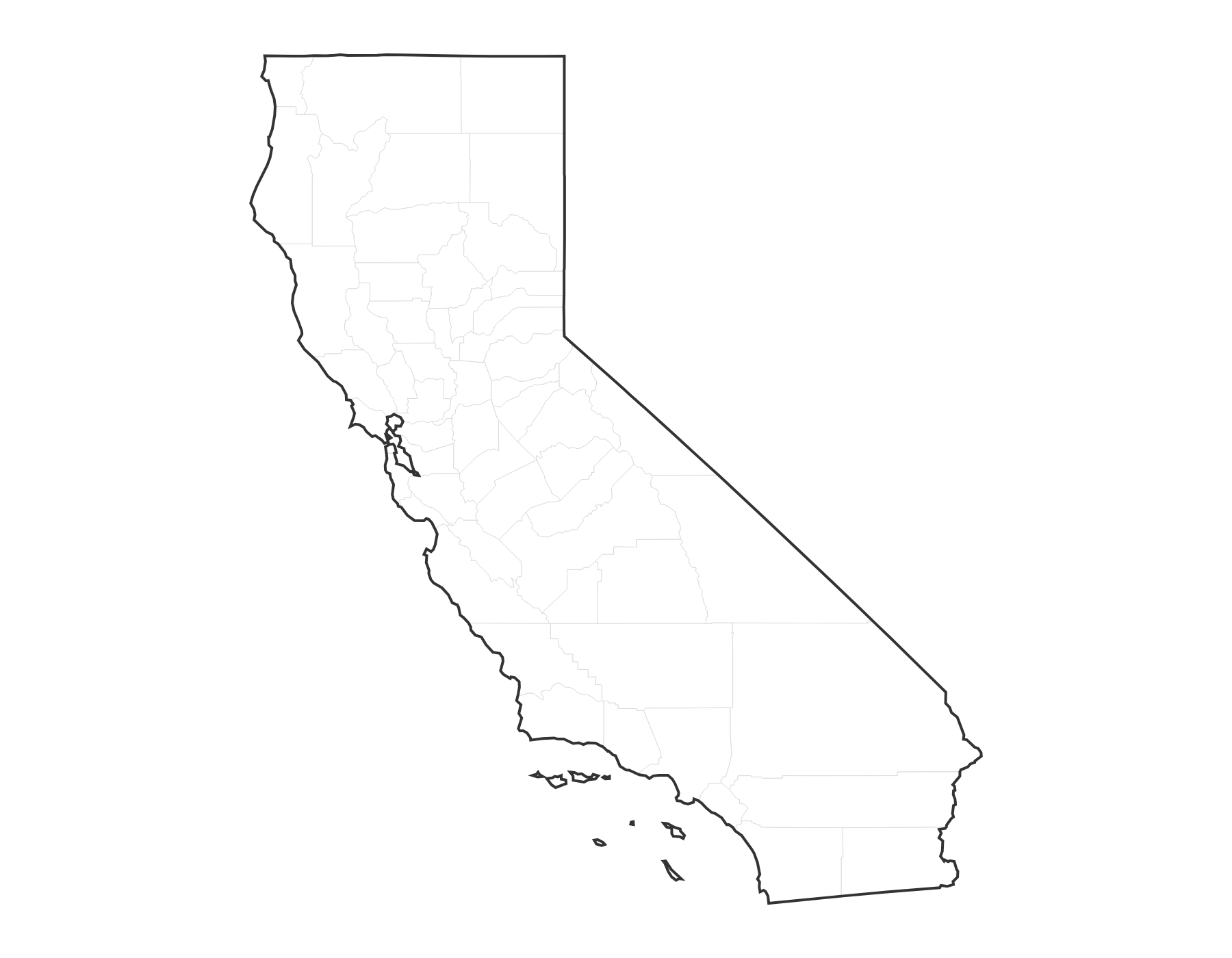 Free printable blank map of California with county outlines. No labels — ideal for geography quizzes, coloring, and classroom activities. 58 counties shown.