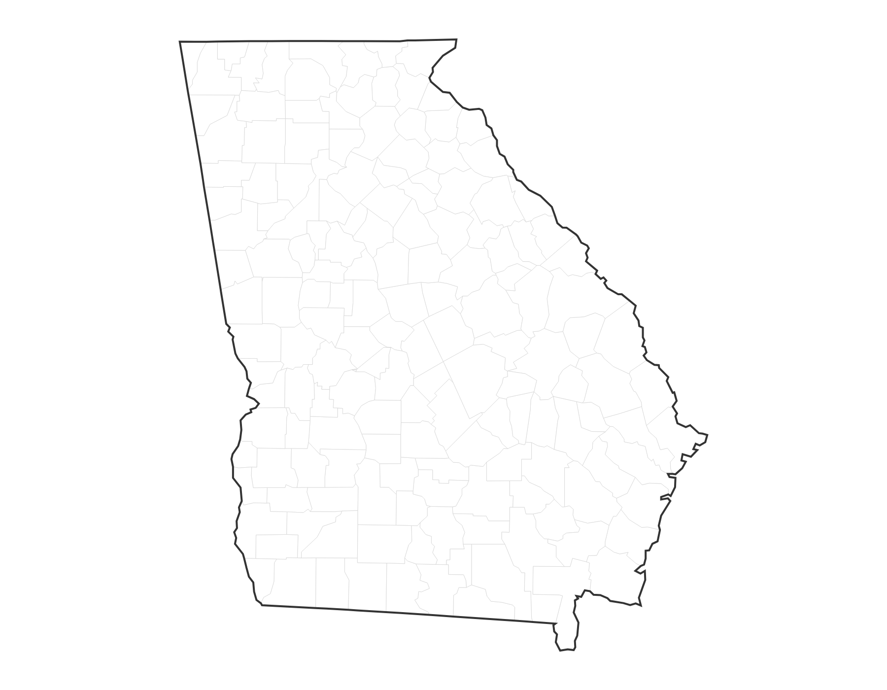 Free printable blank map of Georgia with county outlines. No labels — ideal for geography quizzes, coloring, and classroom activities. 159 counties shown.