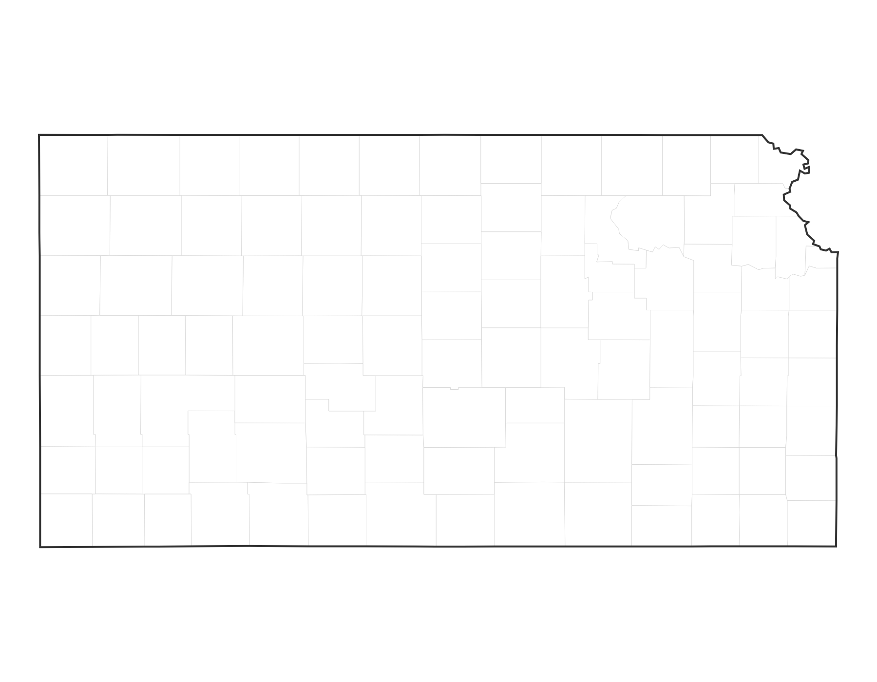 Free printable blank map of Kansas with county outlines. No labels — ideal for geography quizzes, coloring, and classroom activities. 105 counties shown.