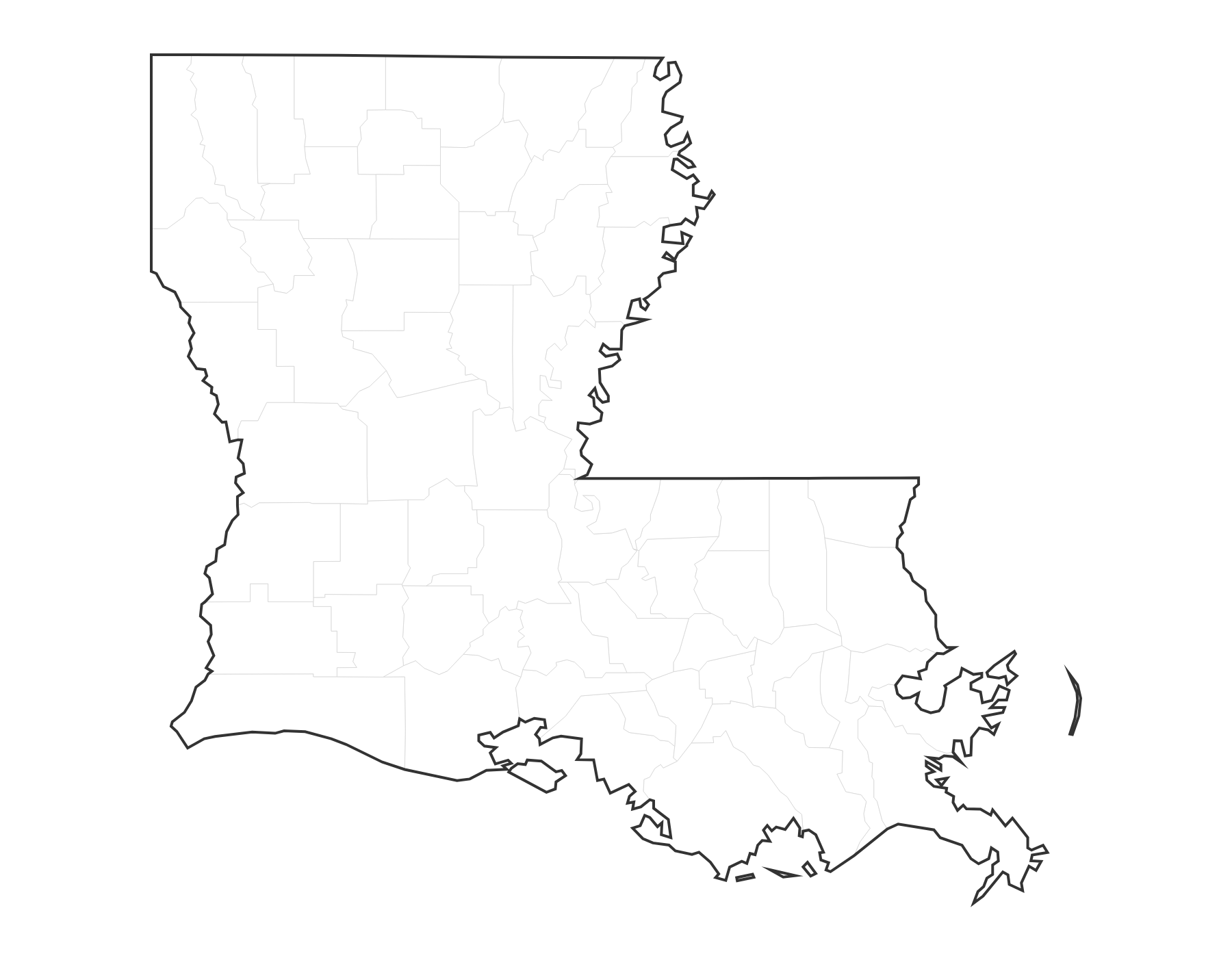 This free printable blank map of Louisiana shows all 64 parish boundaries with no labels. Louisiana, known as the "Pelican State," has its capital in Baton Rouge. Use this blank map for quizzes, coloring activities, or labeling practice.