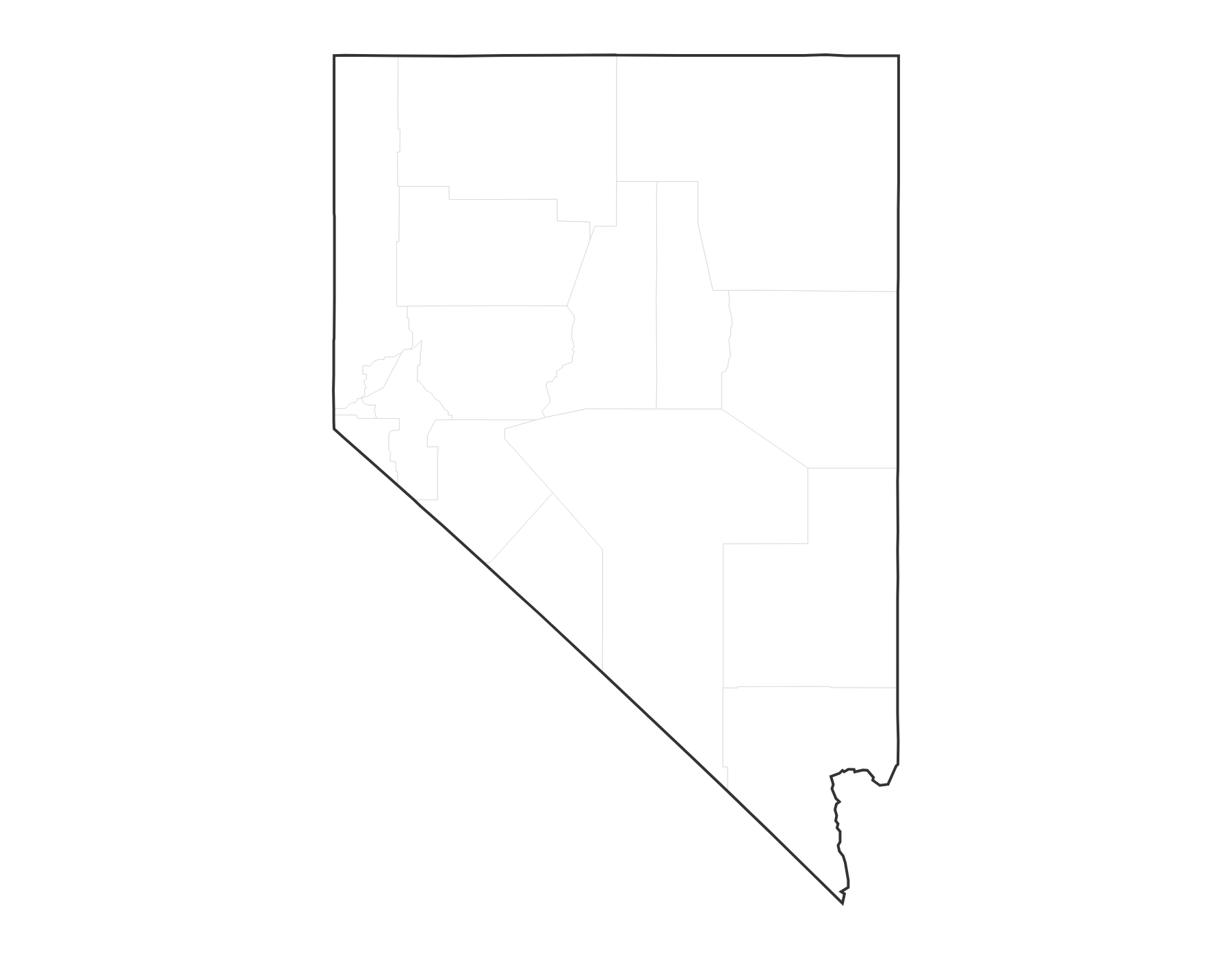 Free printable blank map of Nevada with county outlines. No labels — ideal for geography quizzes, coloring, and classroom activities. 17 counties shown.