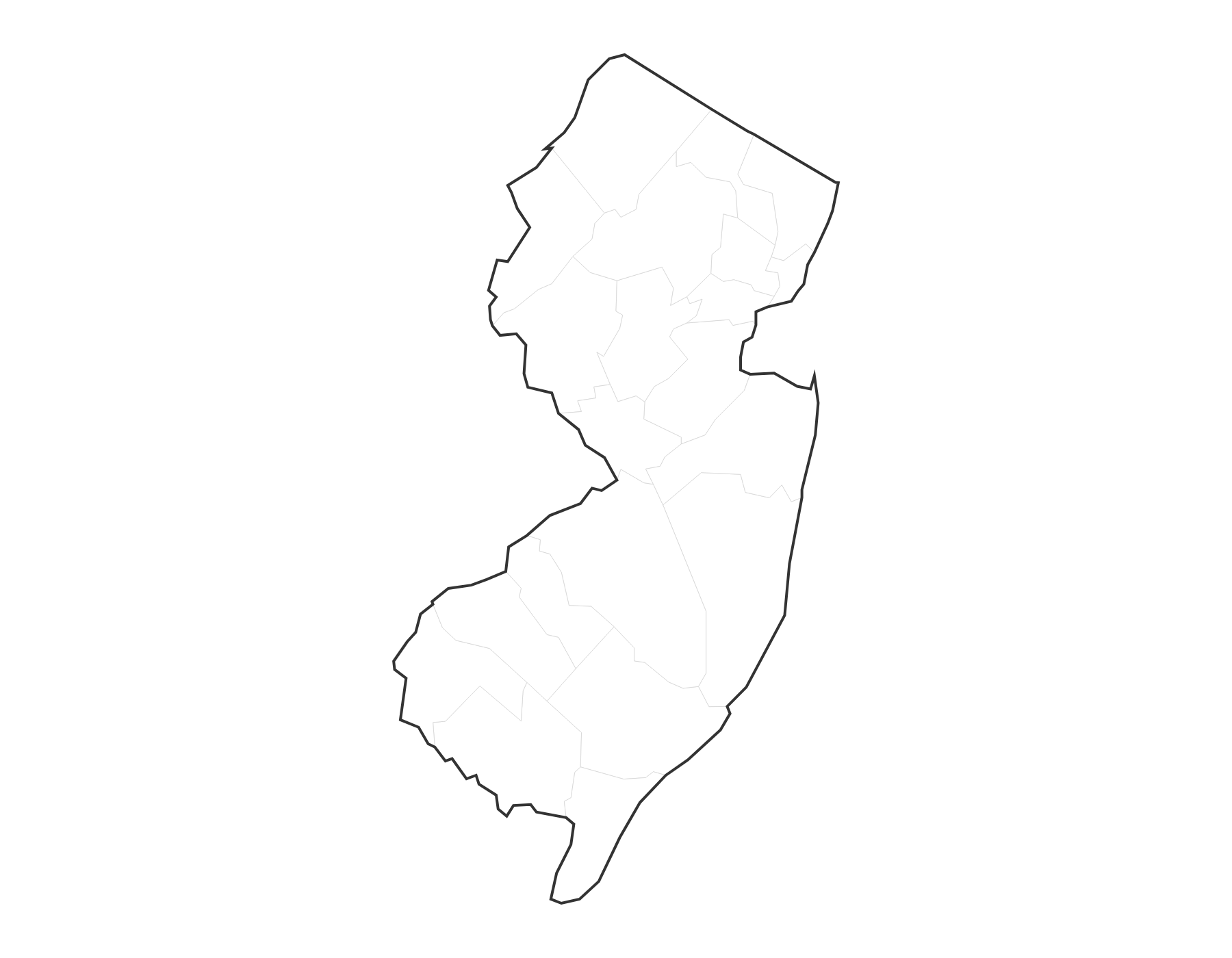 Free printable blank map of New Jersey with county outlines. No labels — ideal for geography quizzes, coloring, and classroom activities. 21 counties shown.