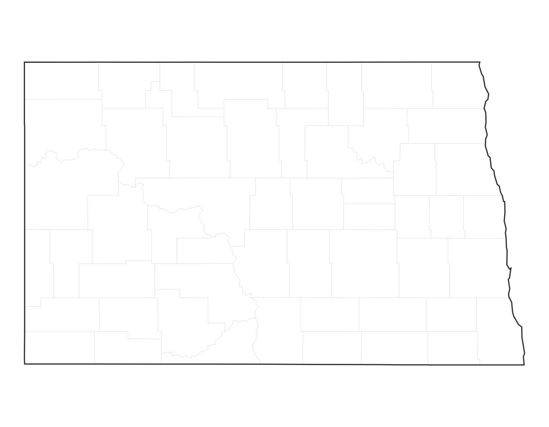 Free printable blank map of North Dakota with county outlines. No labels — ideal for geography quizzes, coloring, and classroom activities. 53 counties shown.