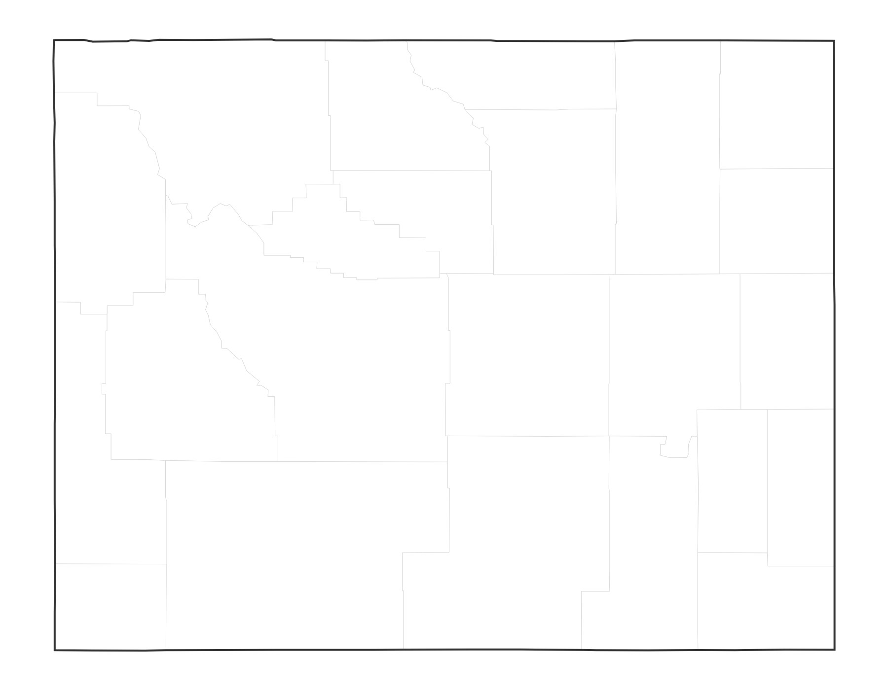 Free printable blank map of Wyoming with county outlines. No labels — ideal for geography quizzes, coloring, and classroom activities. 23 counties shown.
