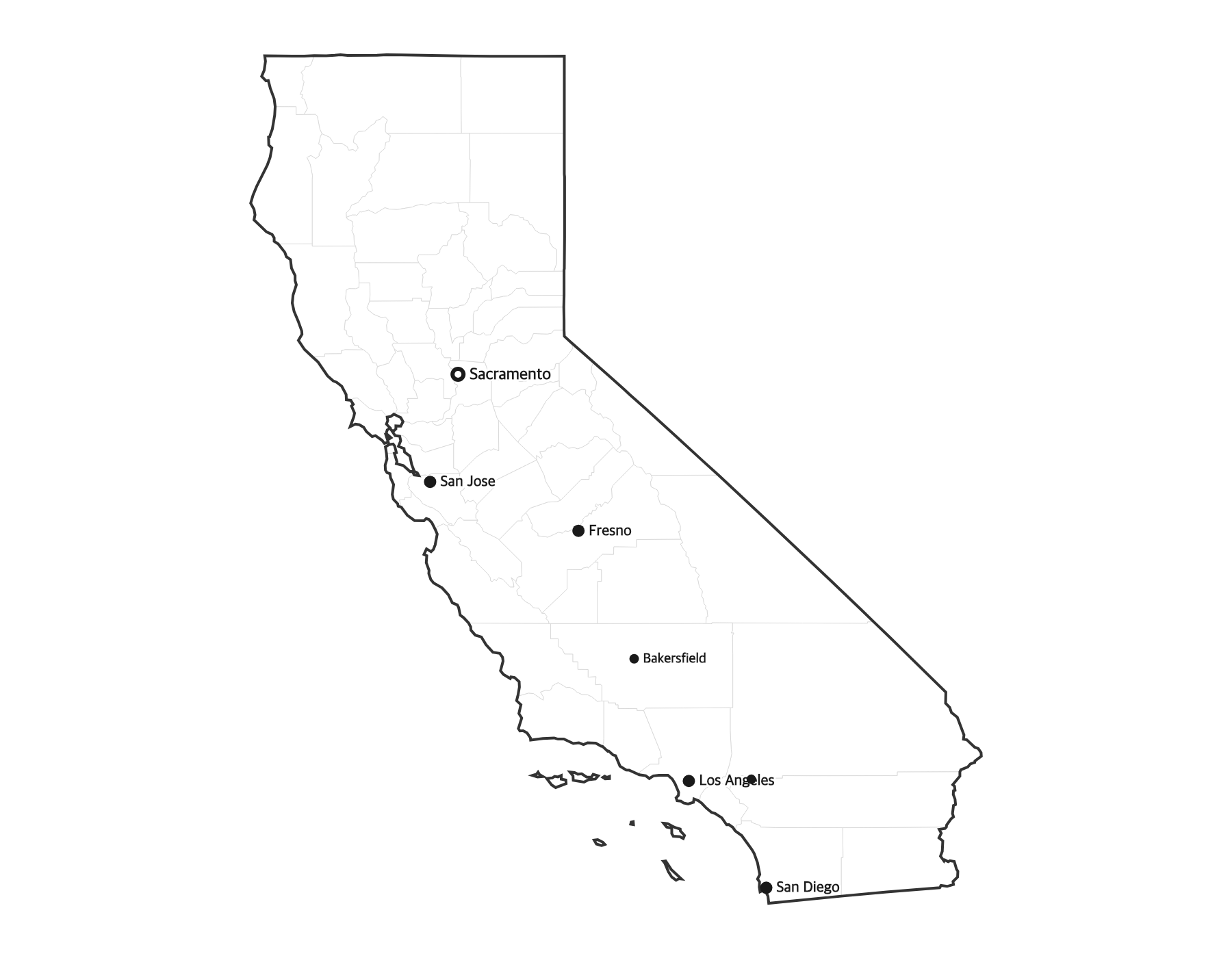 Free printable map of California showing major cities, the state capital Sacramento, and county boundaries. Perfect for geography study, classroom use, and reference.