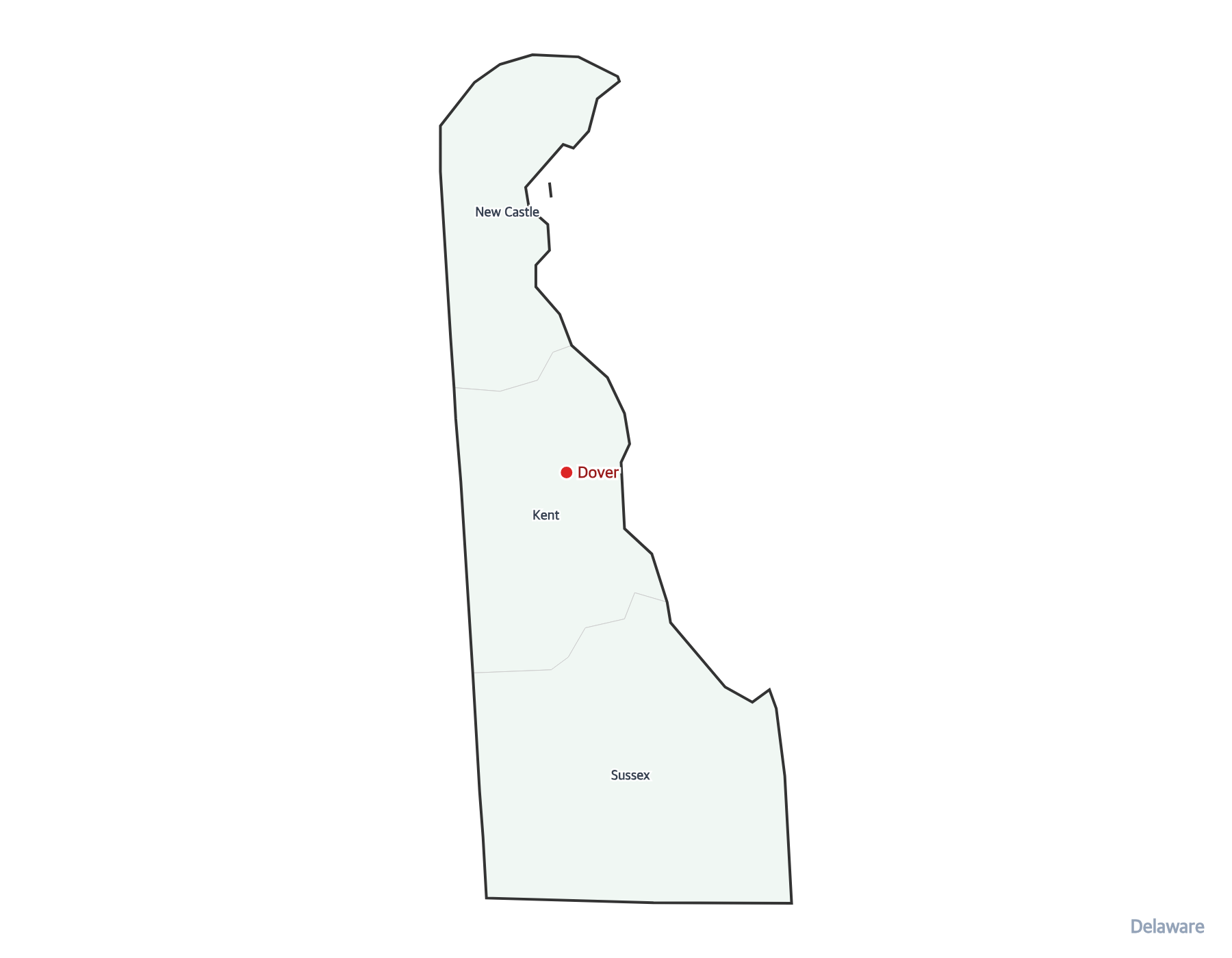 The capital of Delaware is Dover. It is marked with a red dot on this map.