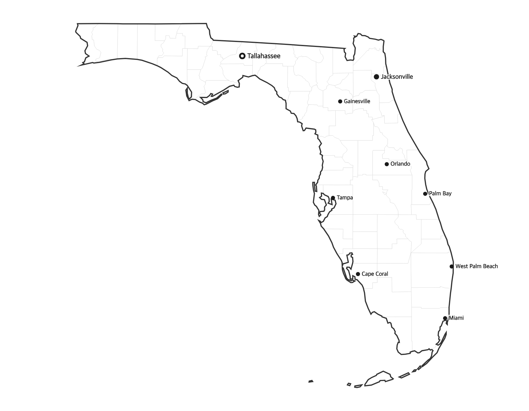 Free printable map of Florida showing major cities, the state capital Tallahassee, and county boundaries. Perfect for geography study, classroom use, and reference.