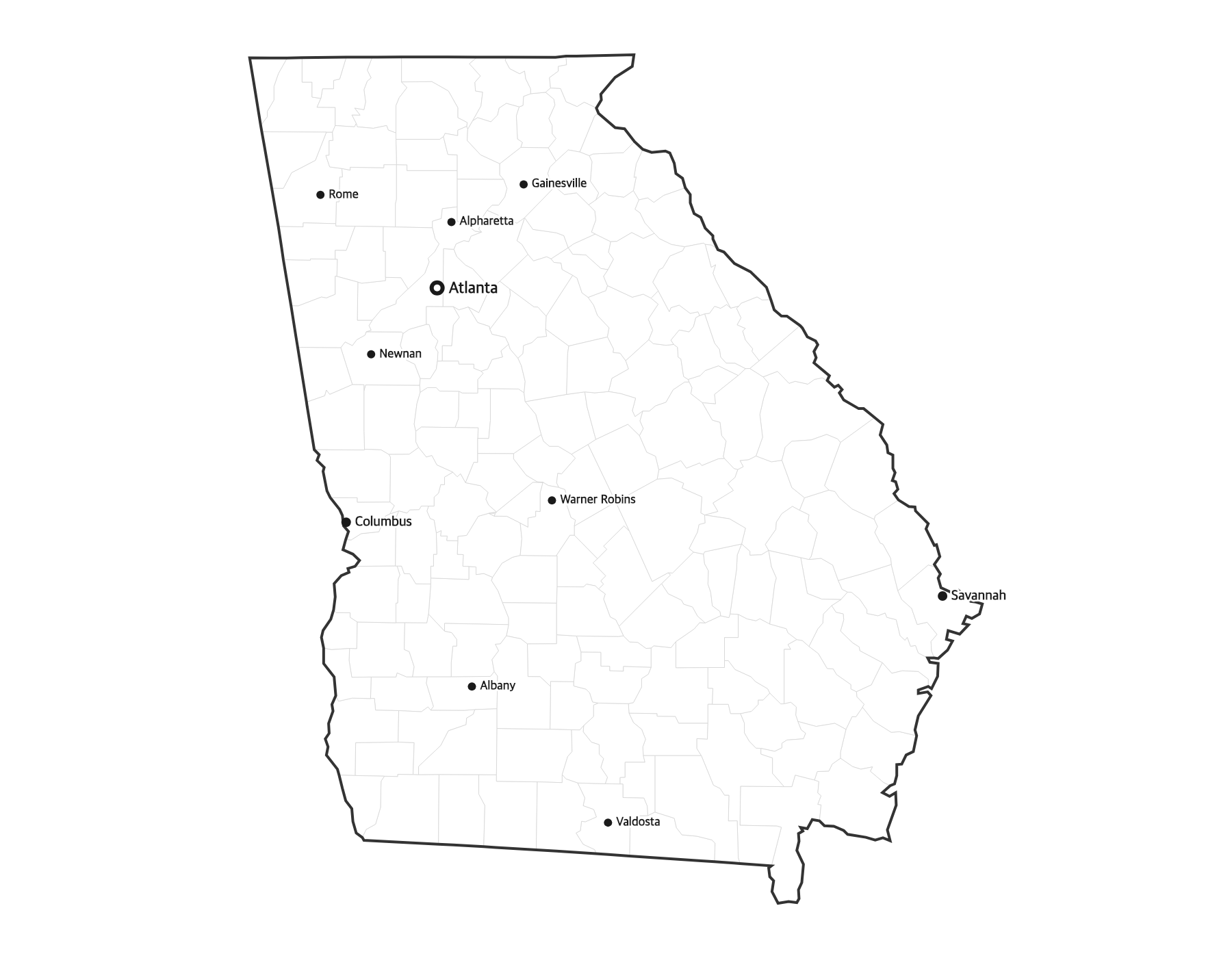 Free printable map of Georgia showing major cities, the state capital Atlanta, and county boundaries. Perfect for geography study, classroom use, and reference.