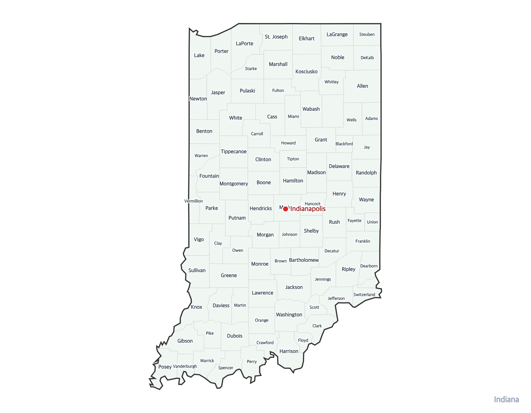 Free printable map of Indiana with all 92 county boundaries labeled. Shows the state capital Indianapolis and county names. Perfect for geography study and classroom use.