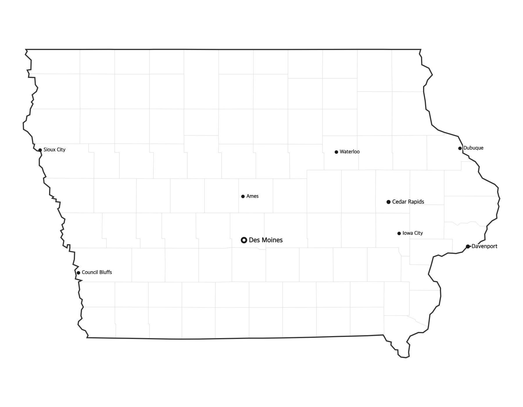 Use this map as a study reference or desk reference for Iowa geography. Pair it with our blank Iowa map for testing — students label cities and the capital from memory, then check against this reference.