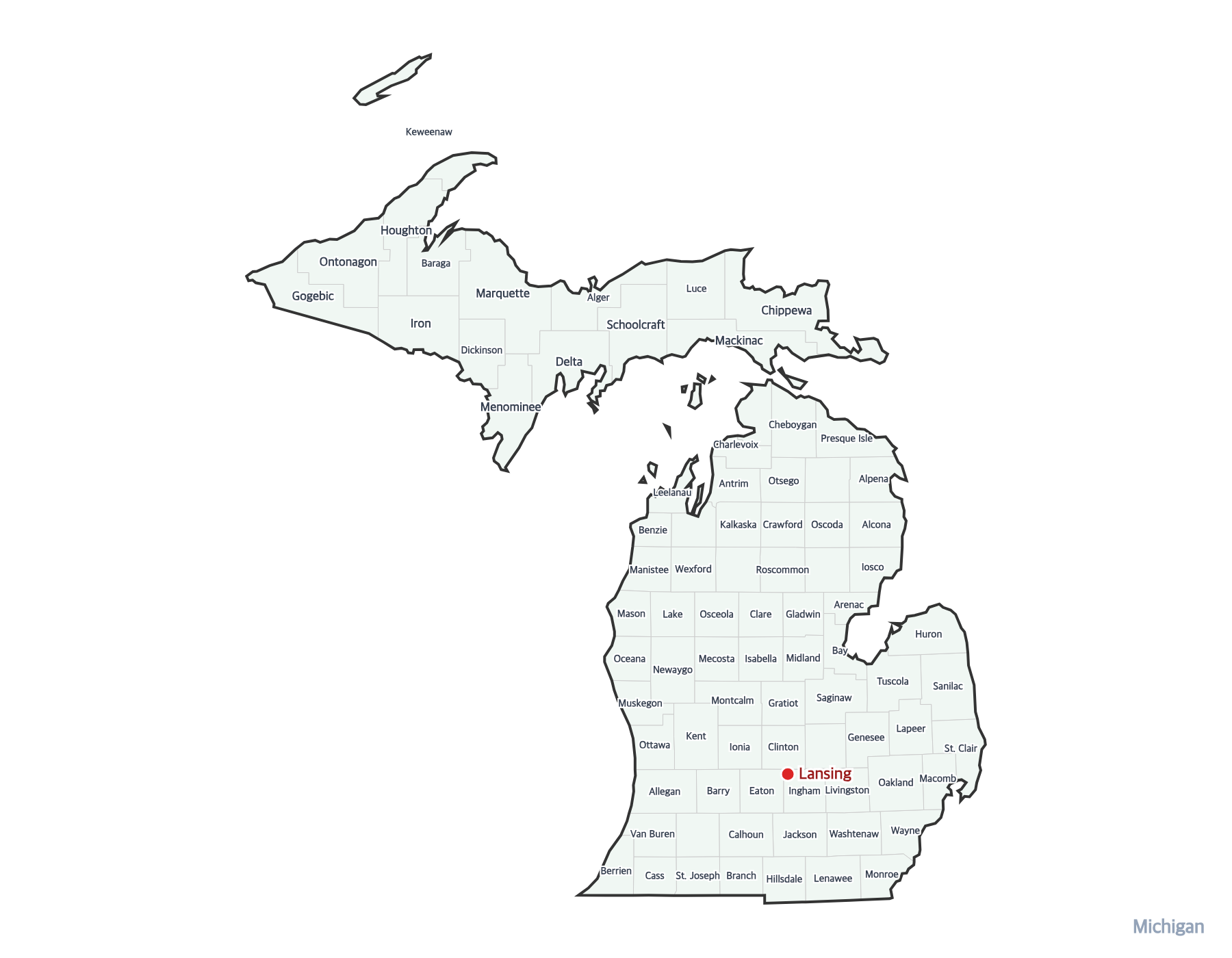 Free printable map of Michigan with all 83 county boundaries labeled. Shows the state capital Lansing and county names. Perfect for geography study and classroom use.