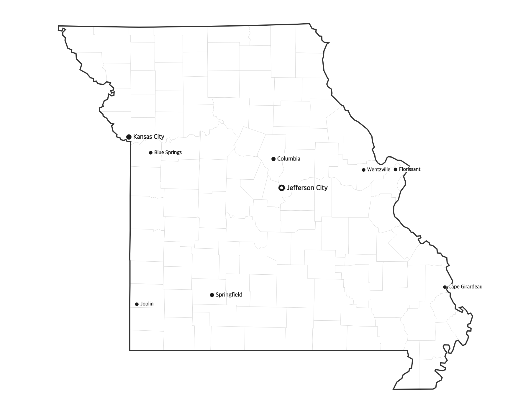 Free printable map of Missouri showing major cities, the state capital Jefferson City, and county boundaries. Perfect for geography study, classroom use, and reference.