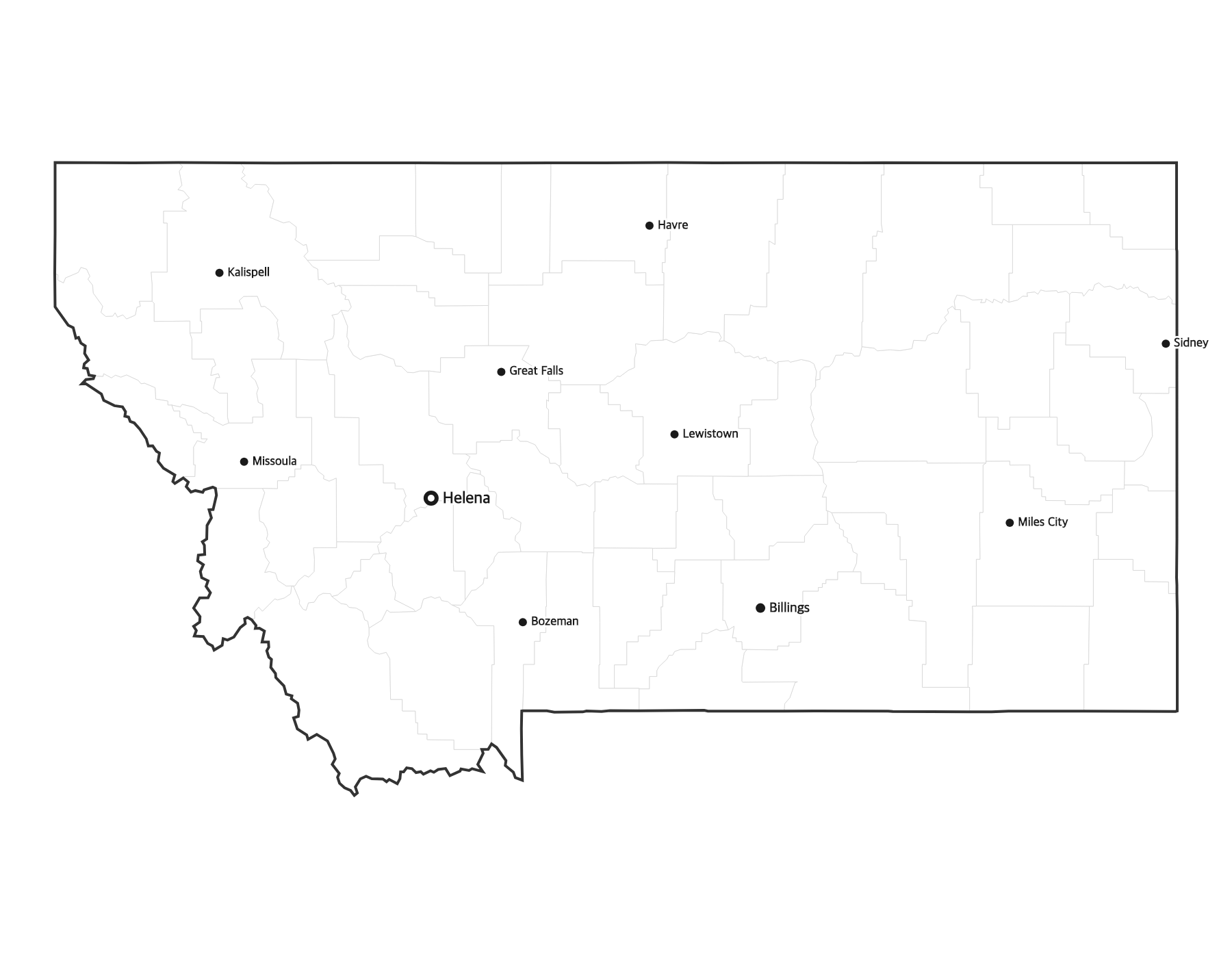 Free printable map of Montana showing major cities, the state capital Helena, and county boundaries. Perfect for geography study, classroom use, and reference.