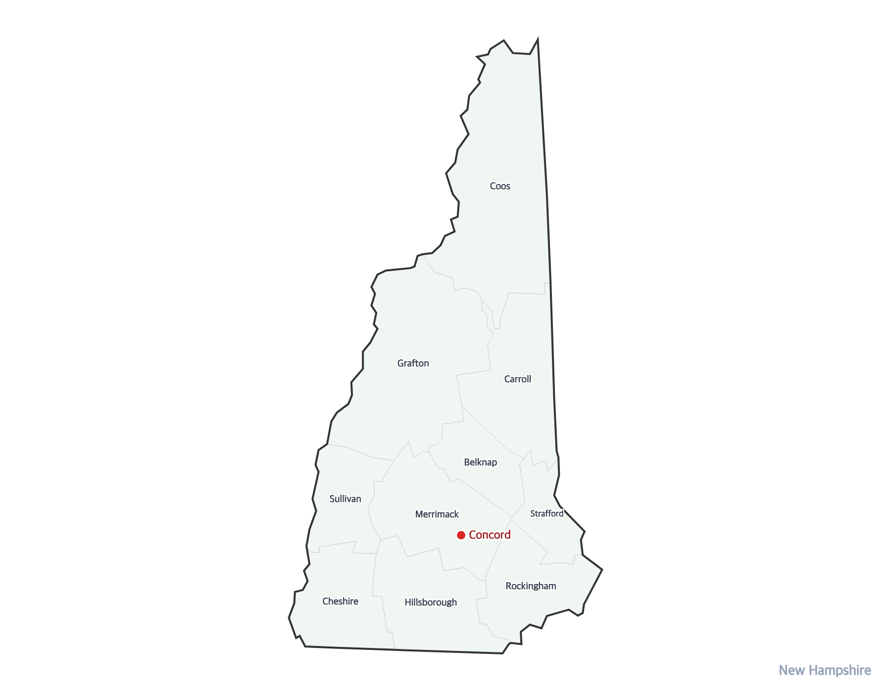 Free printable map of New Hampshire with all 10 county boundaries labeled. Shows the state capital Concord and county names. Perfect for geography study and classroom use.