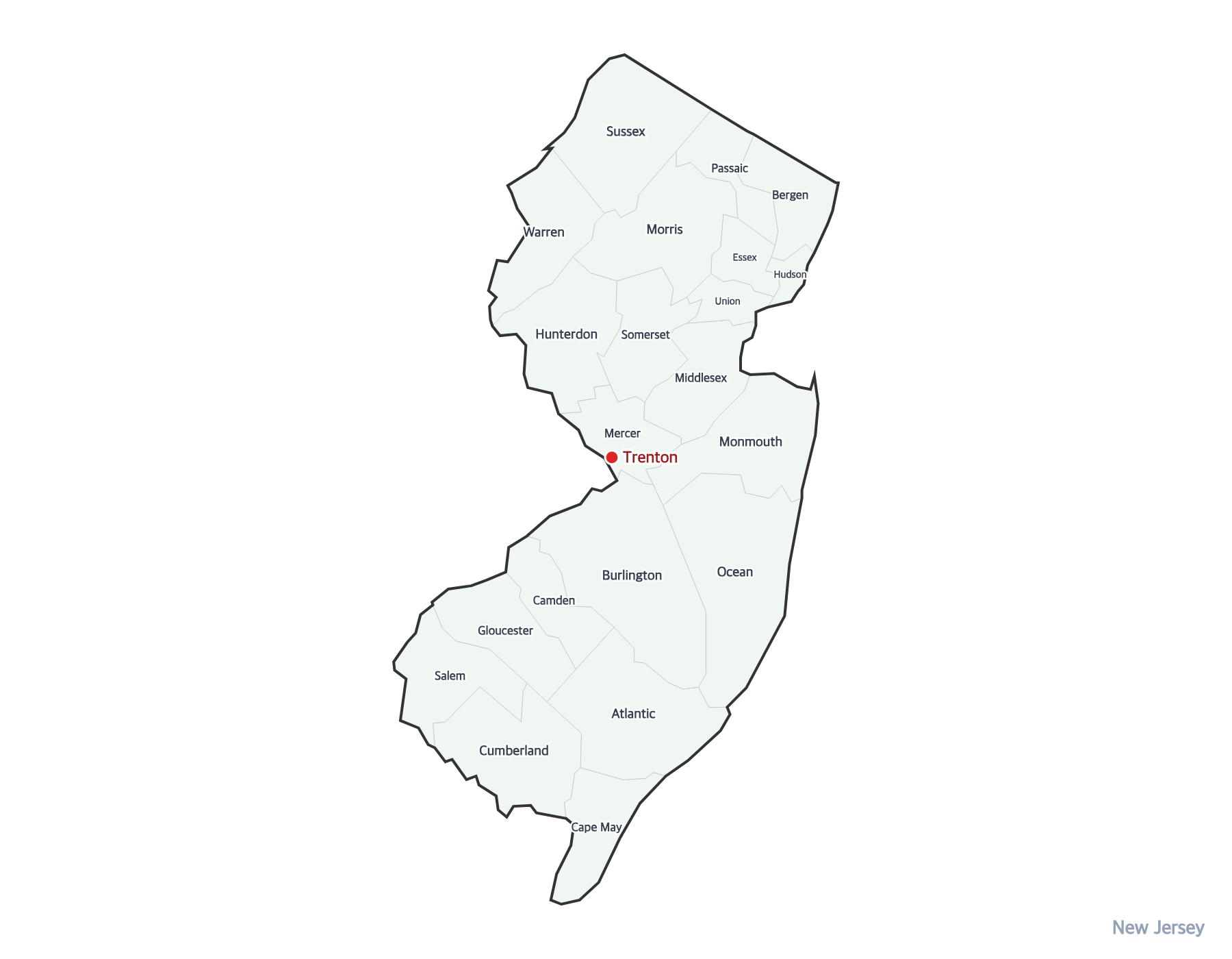 The capital of New Jersey is Trenton. It is marked with a red dot on this map.