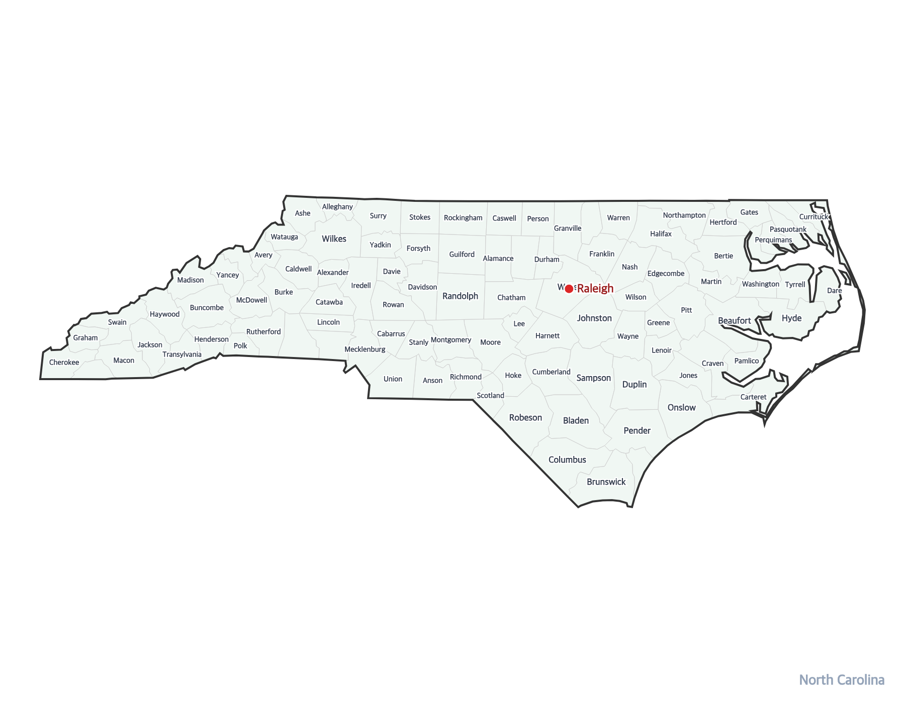 Free printable map of North Carolina with all 100 county boundaries labeled. Shows the state capital Raleigh and county names. Perfect for geography study and classroom use.