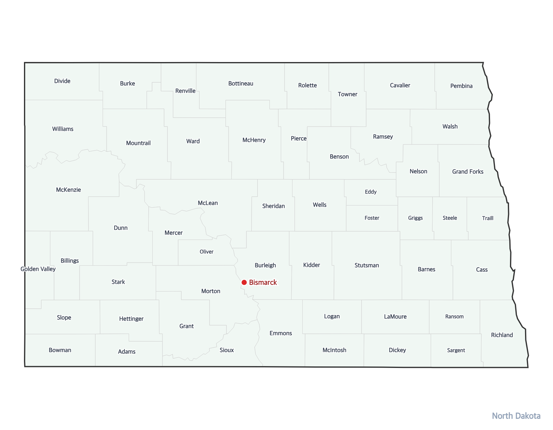 Free printable map of North Dakota with all 53 county boundaries labeled. Shows the state capital Bismarck and county names. Perfect for geography study and classroom use.