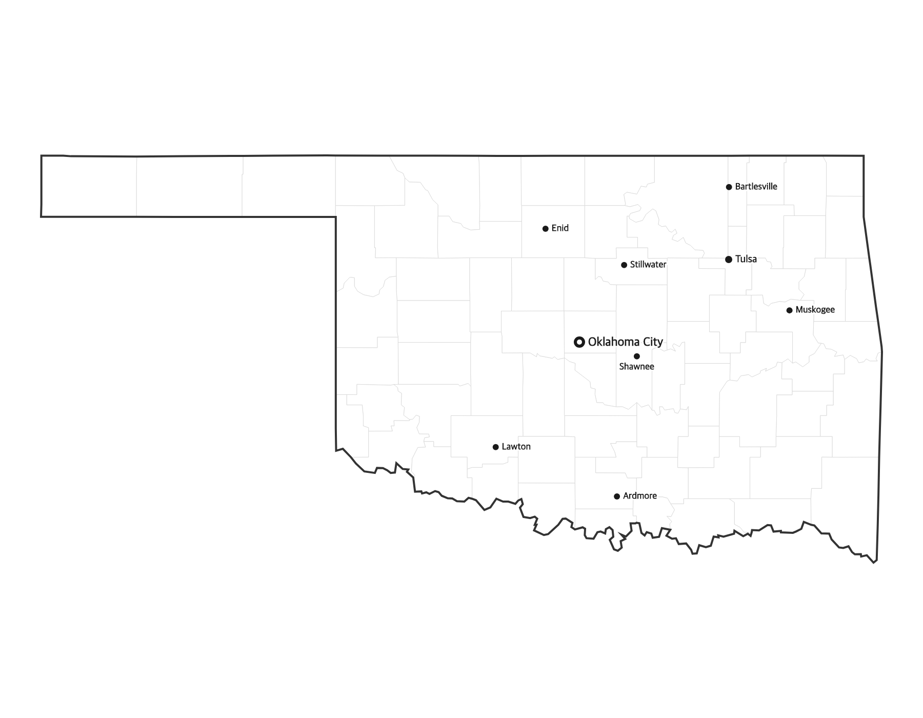 Free printable map of Oklahoma showing major cities, the state capital Oklahoma City, and county boundaries. Perfect for geography study, classroom use, and reference.