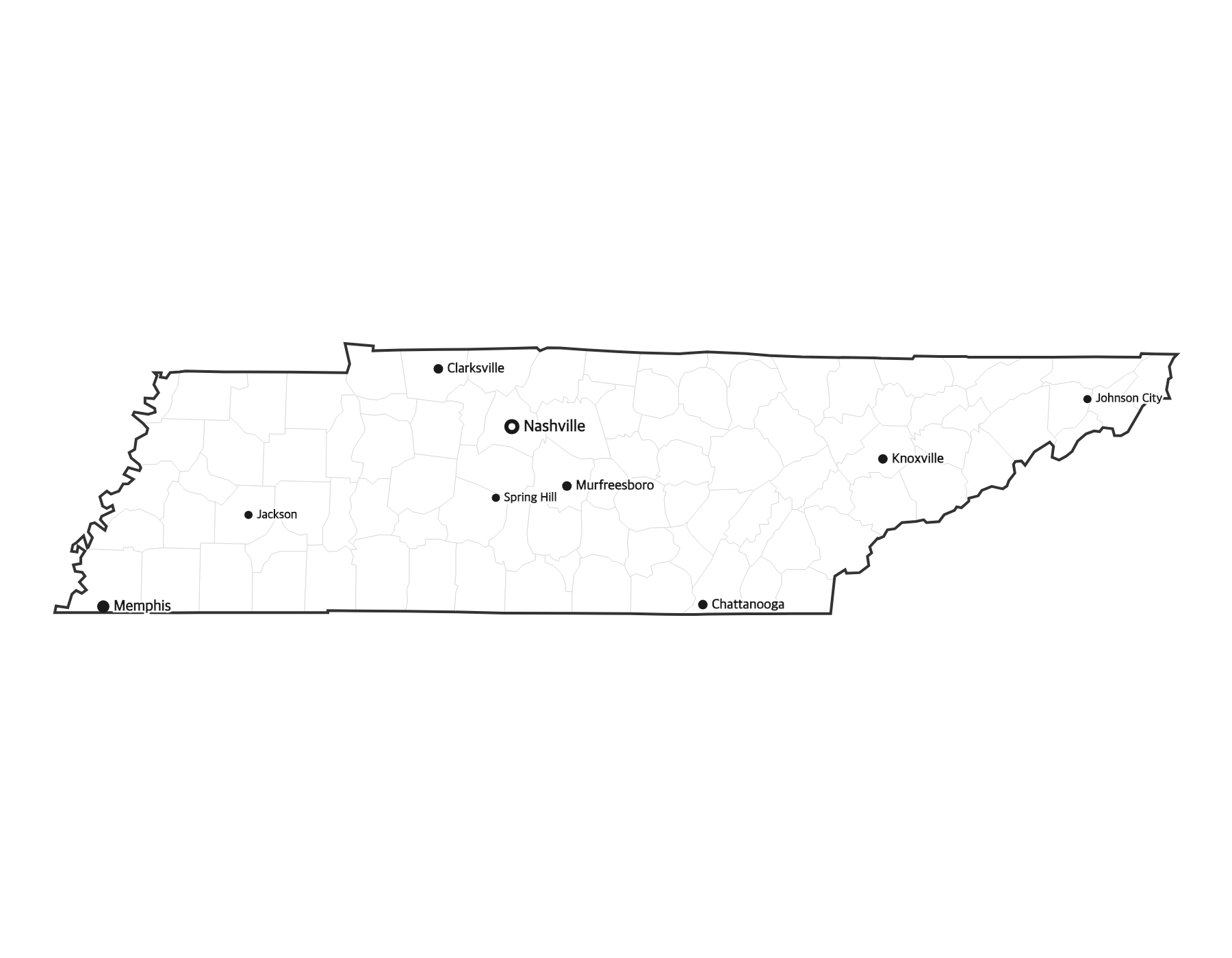 Use this map as a study reference or desk reference for Tennessee geography. Pair it with our blank Tennessee map for testing — students label cities and the capital from memory, then check against this reference.