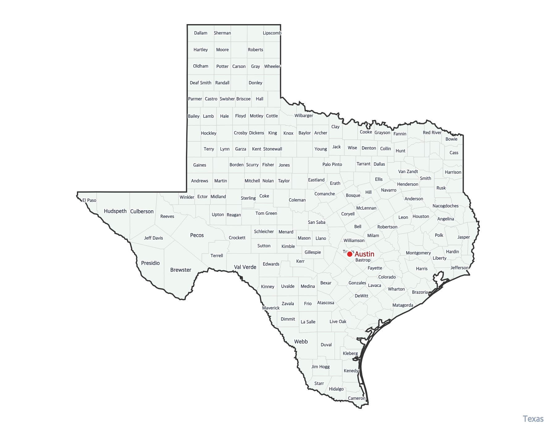 Free printable map of Texas with all 254 county boundaries labeled. Shows the state capital Austin and county names. Perfect for geography study and classroom use.