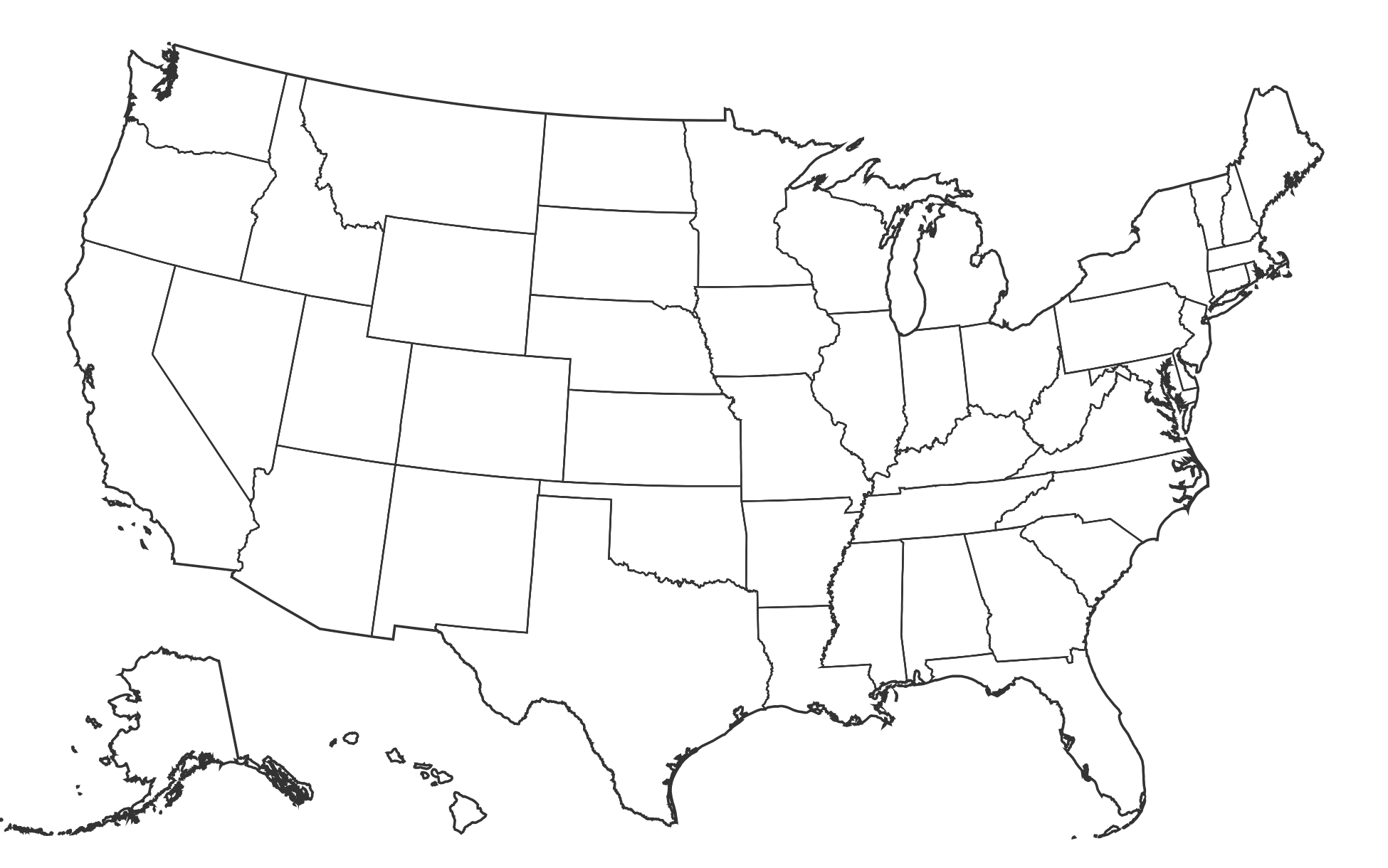 Free printable blank map of the United States with state outlines only. No labels, no names — perfect for geography quizzes, coloring, and classroom activities.