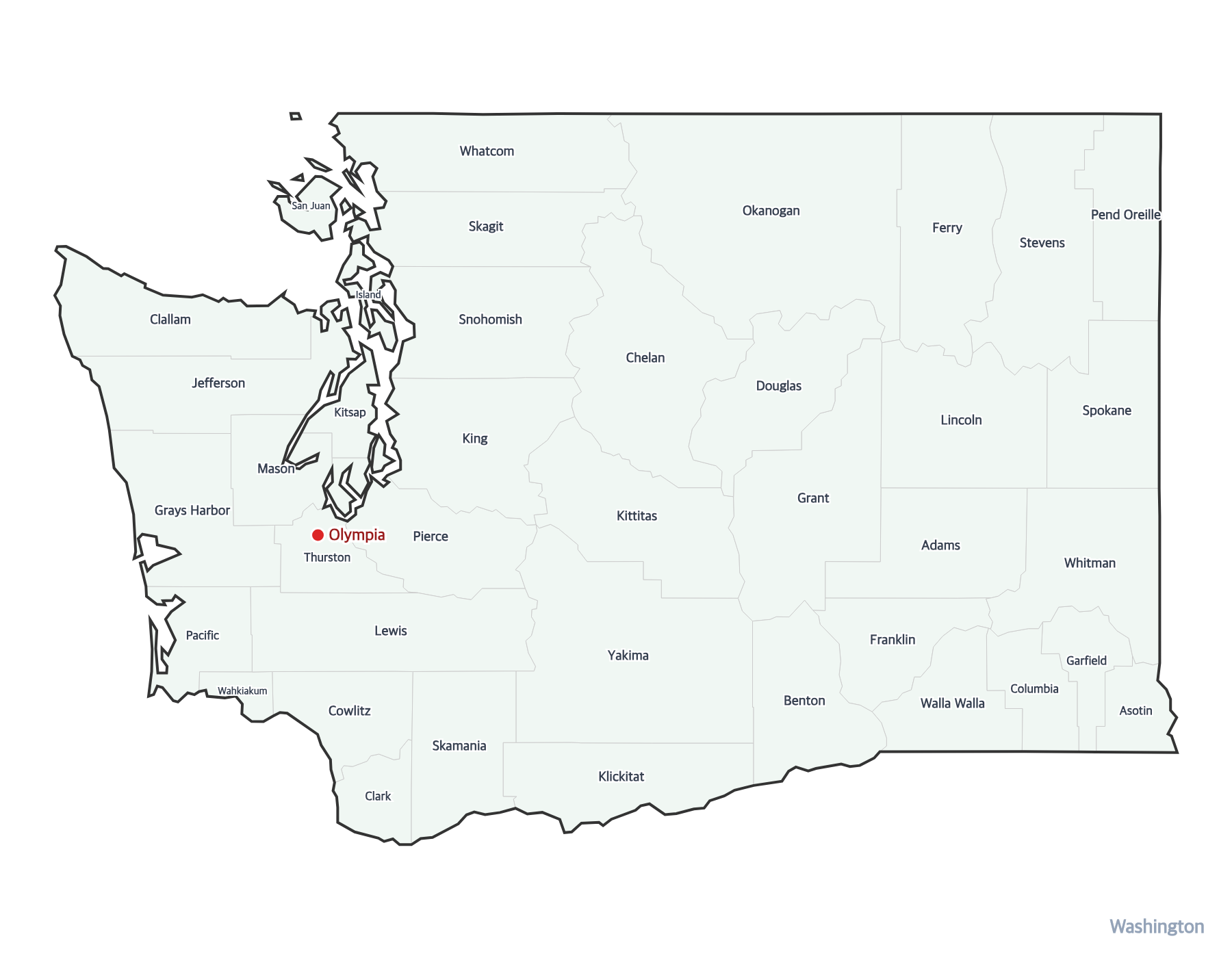 Free printable map of Washington with all 39 county boundaries labeled. Shows the state capital Olympia and county names. Perfect for geography study and classroom use.