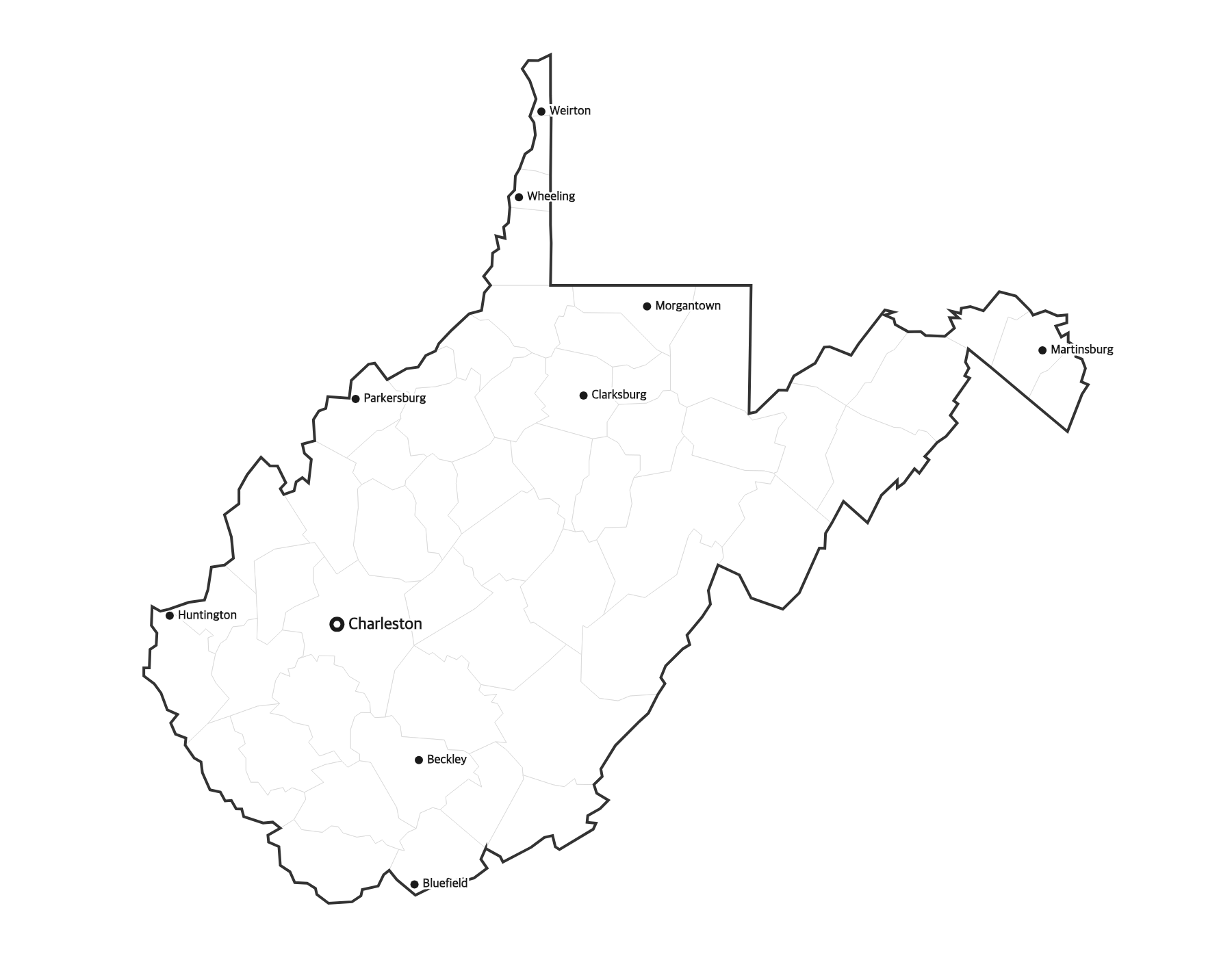 Free printable map of West Virginia showing major cities, the state capital Charleston, and county boundaries. Perfect for geography study, classroom use, and reference.