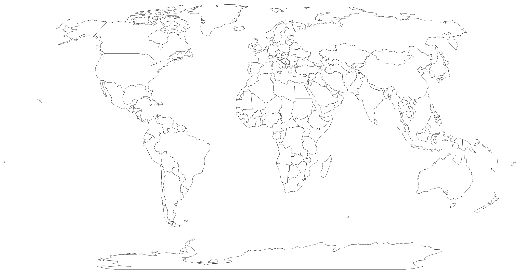 Free printable blank world map with country outlines. No labels — ideal for geography tests, coloring activities, and classroom projects.