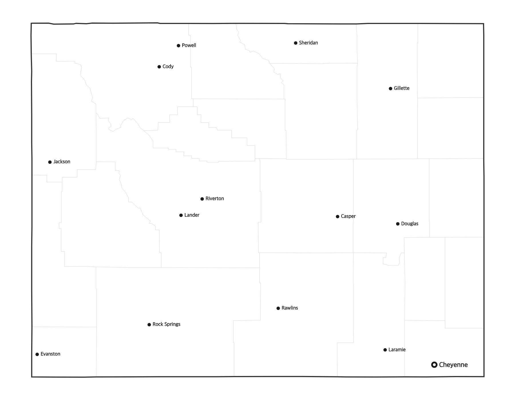The capital of Wyoming is Cheyenne. It is marked with a red dot on this map.